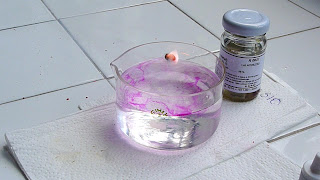 Outra reacção estudada pelo aluno Pedro Reis (e também nas aulas de Físico-Química) foi a reactividade com a água dos metais dos grupos 1 e 2 da TP, sendo disso exemplo a seguinte fotografia da reacção do potássio, K(s):